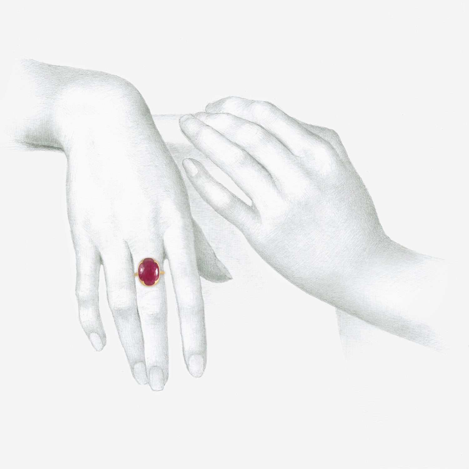 Gabriella Kiss 18k yellow gold & large oval ruby ring, size 6 1/2. The 6.22ct stone measures approximately 5/8″ x 1/2" & is set in Gabriella's signature scalloped bezel.