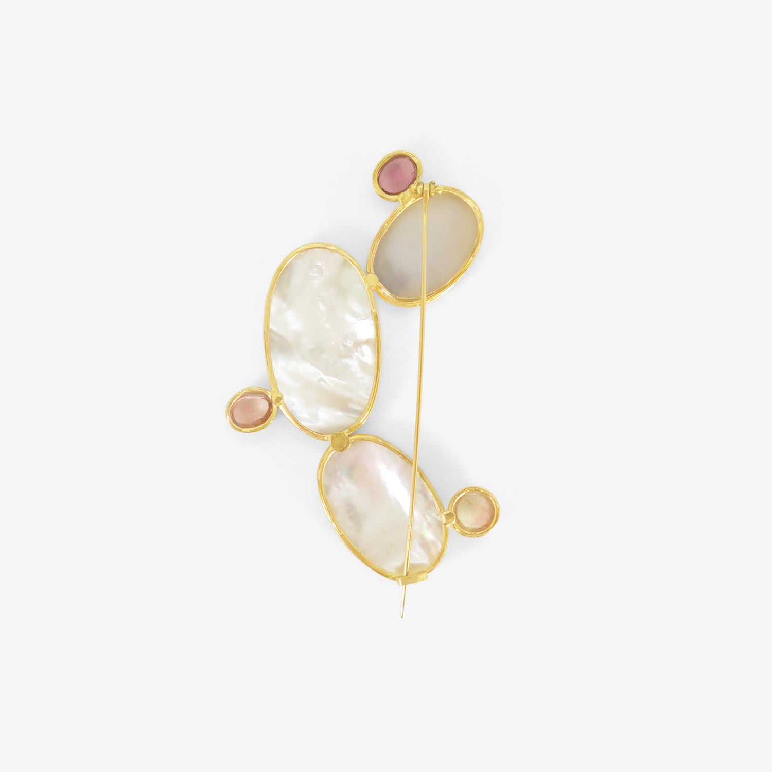 Judy Geib 18k & red dendritic agate exquisite corpse pin #4 with pink tourmaline & mother-of-pearl